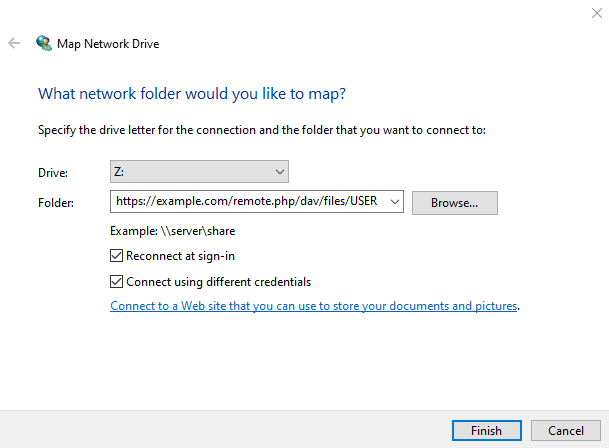 If you use the native Windows implementation of WebDAV, you can map Nextcloud to a new drive using Windows Explorer. Mapping to a drive enables you to browse files stored on a Nextcloud server the way you would browse files stored in a mapped network drive.