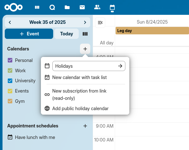 The Nextcloud Calendar app works similar to other calendar applications you can sync your Nextcloud calendars and events with.